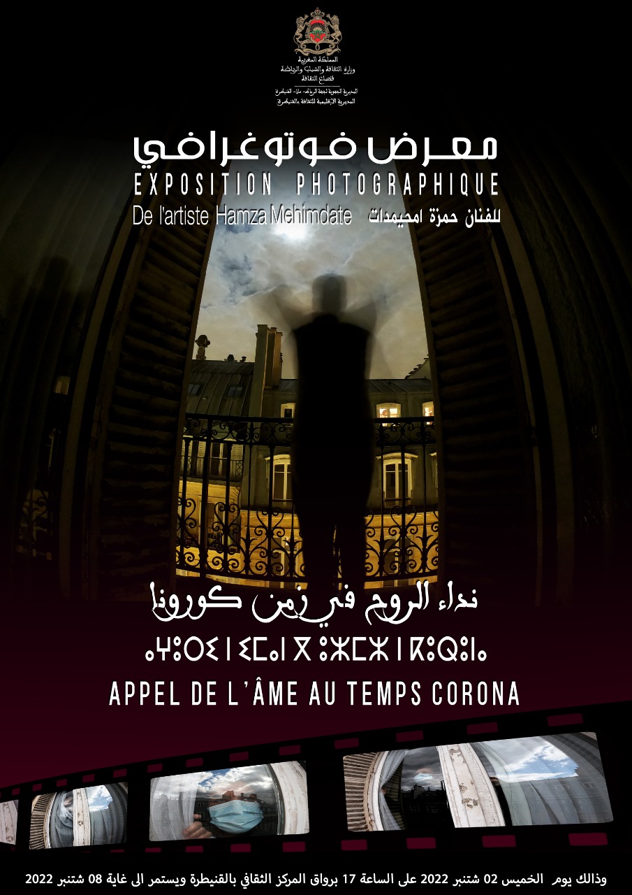 بعد عرض أول لمعرضه الفوتوغرافي الذي اختار له عنوان “نداء الروح في زمن كورونا”، بمدينة الرباط، يحط الفنان الفوتوغرافي حمزة محيمدات بمعرضه في مدينة القنيطرة برواق المركز الثقافي ما بين 02 و8 شتنبر 2022، بدعم من المديرية الاقليمية لقطاع الثقافة.