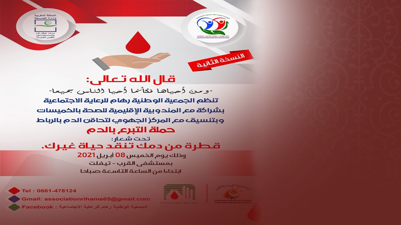 تنظم، يومه (الخميس 8 أبريل 2021) الجمعية الوطنية رهام للرعاية الإجتماعية بشراكة مع المندوبية الإقليمية لوزارة الصحة بالخميسات، و بتنسيق مع المركز الجهوي لتحاقن الدم بالرباط حملة للتبرع بالدم بمدينة تيفلت، تحت شعار ” قطرة من دمك تنقد حياة غيرك “.