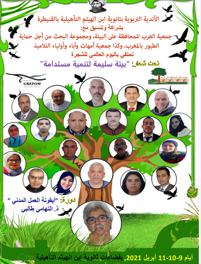 تحتفي الاندية التربوية بثانوية ابن الهيثم التاهيلية بالقنيطرة ايام 9 – 10 و 11 ايريل 2021 بشراكة مع جمعية الغرب للمخافظة على البيئة ومجموعة البحث من اجل حماية الطيور بالمغرب وكذا جمعية امهات وآباء واولياء التلاميذ ، باليوم العالمي للشجرة تحت شعار : ” بيئة سليمة لتنمية مستدامة ”
