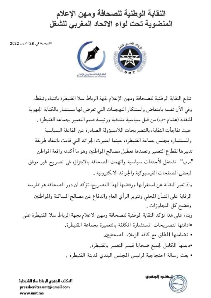 العالم24, تتابع النقابة الوطنية للصحافة ومهن الإعلام لجهة الرباط سلا القنيطرة بانتباه وتيقظ، وفي الآن نفسه بامتعاض واستنكار التهجمات التي تعرض لها مستشار بالكتابة الجهوية للنقابة (هشام -ب) من قبل سياسية منتخبة ورئيسة قسم التعمير بجماعة القنيطرة .