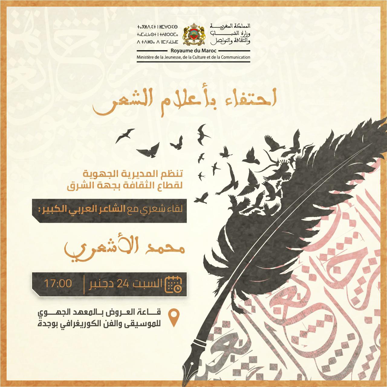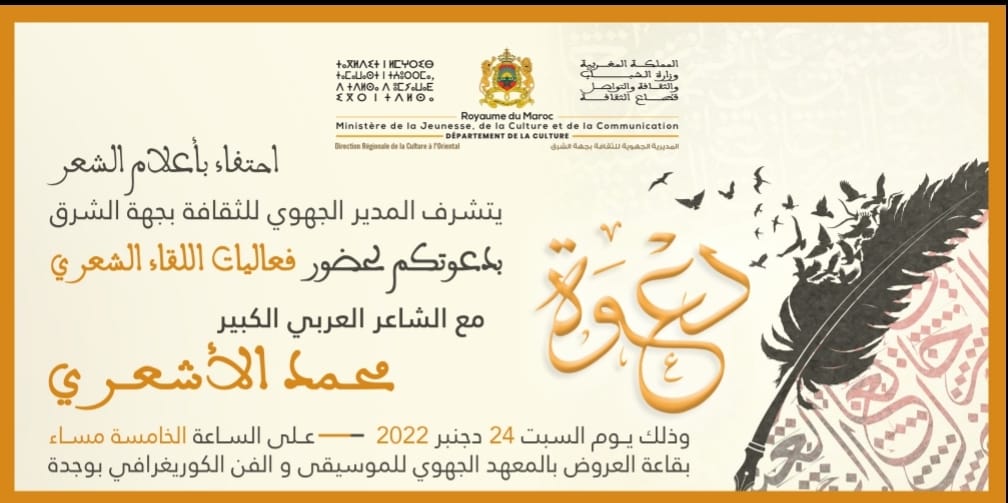 العالم24, في إطار سلسلة “احتفاء بأعلام الشعر”، تنظم المديرية الجهوية للثقافة بجهة الشرق أمسية شعرية ولقاء أدبيا مع الشاعر العربي الكبير محمد الأشعري يوم 24 دجنبر 2022 بقاعة العروض بالمعهد الجهوي للموسيقى والفن الكوريغرافي بوجدة على الساعة الخامسة مساء.