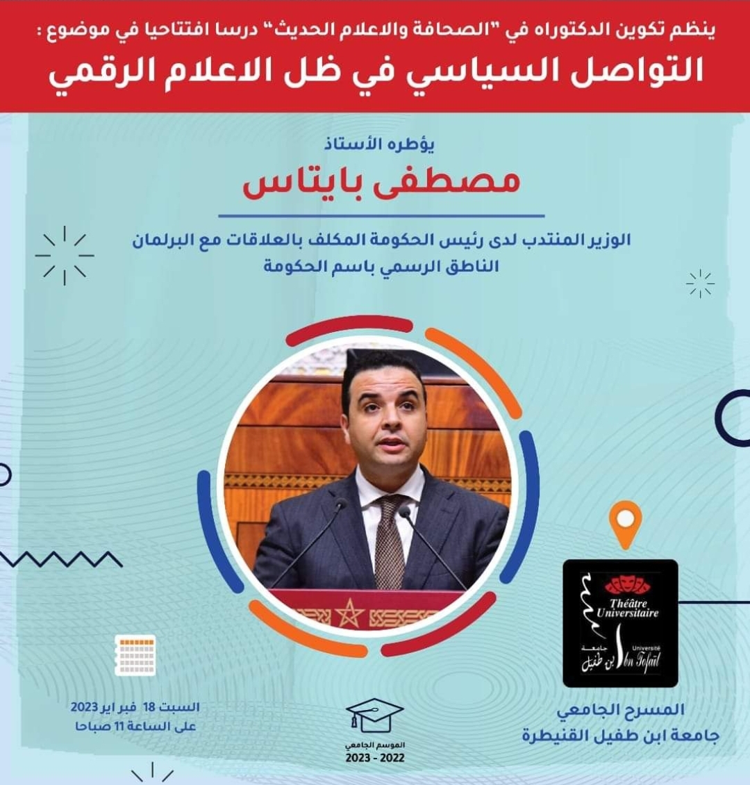 العالم24, قدم الوزير المنتدب لدى رئيس الحكومة المكلف بالعلاقات مع البرلمان، الناطق الرسمي باسم الحكومة، مصطفى بايتاس، اليوم السبت، درسا افتتاحيا لتكوين الدكتوراه في الصحافة والإعلام الحديث بكلية اللغات والآداب والفنون التابعة لجامعة ابن طفيل بالقنيطرة، برسم الموسم الجامعي 2022-2023.