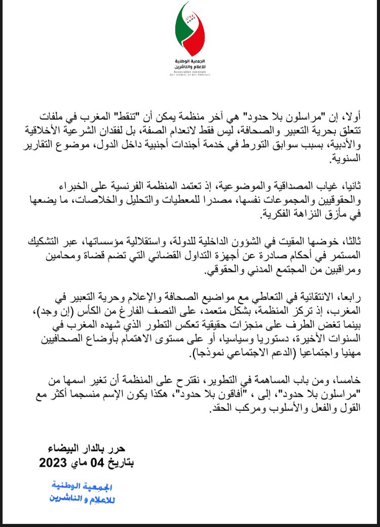 خامسا: ومن باب المساهمة في التطوير، نقترح على المنظمة أن تغير اسمها من “مراسلون بلا حدود” إلى “أفاقون بلا حدود”، هكذا يكون الإسم منسجما أكثر مع القول والفعل والأسلوب ومركب الحقد.