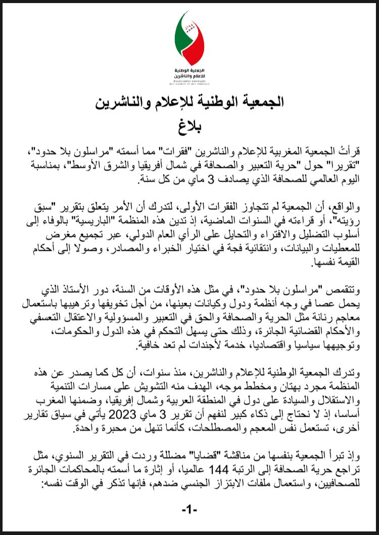 العالم24, في ظل الاحتفال باليوم العالمي للصحافة، أصدرت الجمعية المغربية للإعلام والناشرين تصريحا يدين فيه تقرير “مراسلون بلا حدود” حول حرية التعبير والصحافة في شمال أفريقيا والشرق الأوسط.