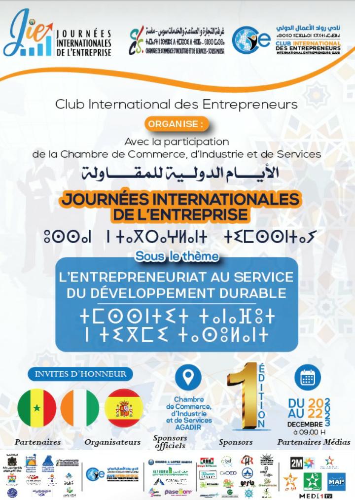 العالم24, ينظم النادي الدولي لرواد الأعمال CIE بمشاركة غرفة التجارة والصناعة والخدمات لجهة سوس ماسة، من 20 إلى22 ديسمبر الجاري، النسخة الأولى من “ الأيام الدولية للمقاولة ” تحت شعار: “ريادة الأعمال في خدمة التنمية المستدامة”. وسيقام هذا الحدث بغرفة التجارة والصناعة والخدمات سوس ماسة بشراكة مع مؤسسات عمومية محلية ووطنية ودولية.