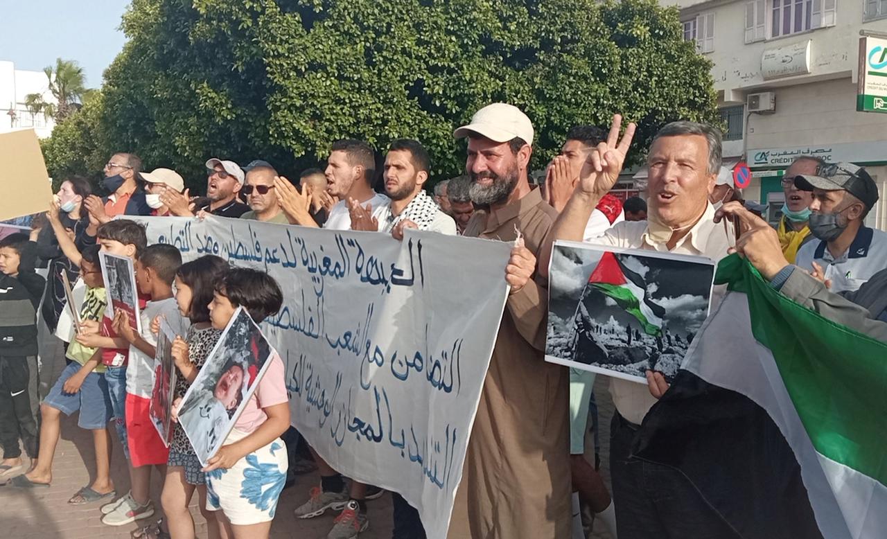 شهدت مدينة الخميسات، يوم الأحد الاخير من شهر ماي الجاري، وقفة نظمت بساحة المسيرة الخضراء، للتنديد بالجرائم والاعتداءات الإسرائيلية الأخيرة بمدينة القدس الشريف والضفة الغربية وقطاع غزة التي تقترفها قوات الاحتلال الإسرائيلية في حق الفلسطينيين. وحمل المشاركون في الوقفة التضامنية مع الفلسطينيين أعلام فلسطين ولافتات مكتوبة عليها عبارات منددة بالعدوان الذي تشنه قوات الاحتلال منذ أيام، أسفر عن سقوط نحو عشرات الشهداء إلى حد كتابة هذه السطور. وردد المشاركون خلال هذه الوقفة، التي نظمت بمبادرة من فعاليات سياسية وحقوقية ومدنية، شعارات تطالب بالوقف الفوري للانتهاكات الإسرائيلية بالمدينة المقدسة، والاعتداءات المستمرة على قطاع غزة والضفة الغربية. ودعوا المجتمع الدولي التدخل من أجل الضغط على إسرائيل للالتزام بالقرارات الدولية ووقف انتهاكاتها المستمرة اتجاه الفلسطينيين، كما أكدوا تضامن الشعب المغربي الدائم مع الشعب الفلسطيني، والوقوف معه في مواجهة هذه الاعتداءات، حتى استرجاع حقوقه المشروعة وإقامة دولته الفلسطينية وعاصمتها القدس الشريف.