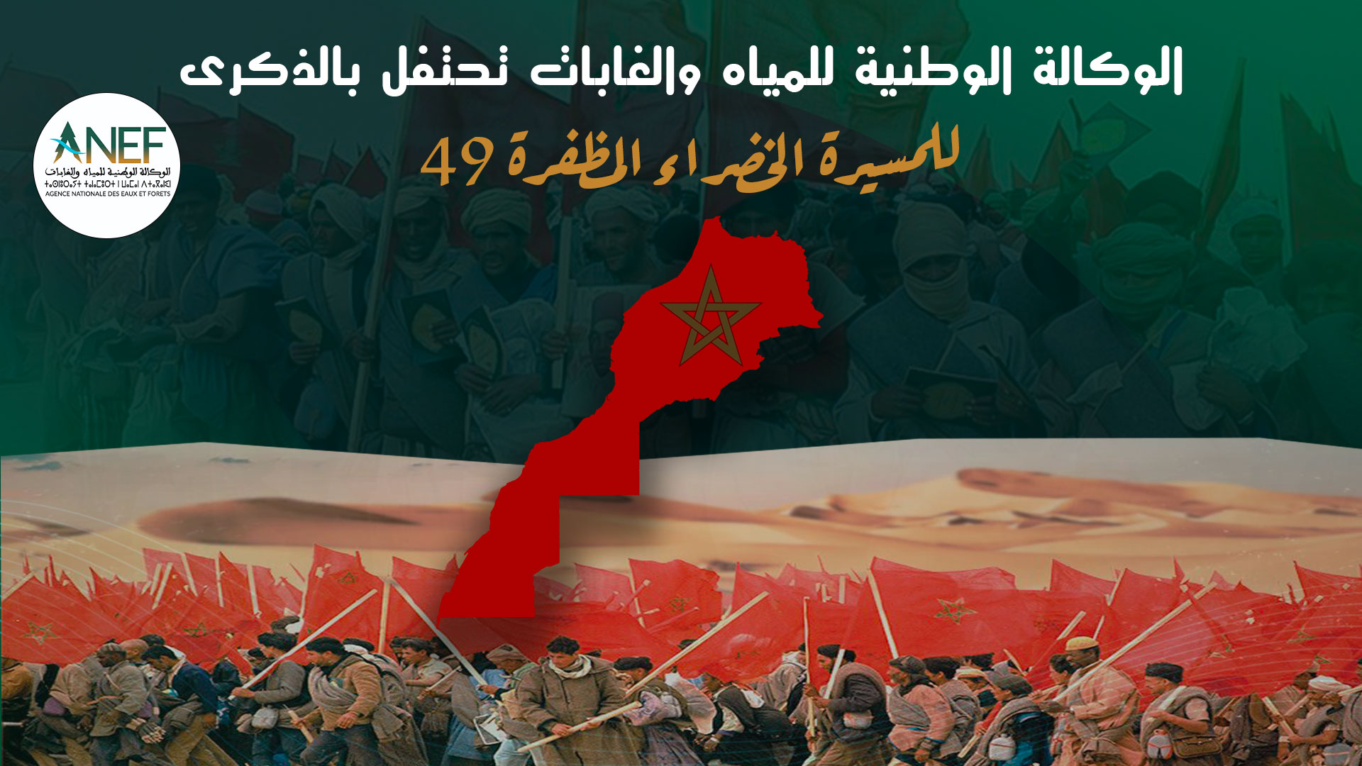 بمناسبة حلول الذكرى التاسعة والأربعين للمسيرة الخضراء المظفرة التي جسدت، باعتبارها ملحمة تاريخية، أروع صور التلاحم بين العرش العلوي المنيف والشعب المغربي الوفي من أجل استكمال الاستقلال الوطني وتحقيق الوحدة الترابية المقدسة، يتشرف خديم الأعتاب الشريفة السيد عبد الرحيم هومي، مدير الوكالة الوطنية للمياه والغابات، أصالة عن نفسه ونيابة عن كافة العاملين بهذه الأخيرة، بتقديم فروض الطاعة والولاء اللائقة بالمقام العالي بالله، وبأصدق عبارات التهاني وأسمى المتمنيات، إلى السدة العالية بالله صاحب الجلالة الملك محمد السادس نصره الله وأيده، سائلا المولى عز وجل أن يديم على جلالته نعمة الصحة والعافية، وأن يعيد عليه هذه المناسبة الوطنية الغالية بالخير واليمن والبركات، وعلى وطننا الحبيب بمزيد من الرفعة والنماء.