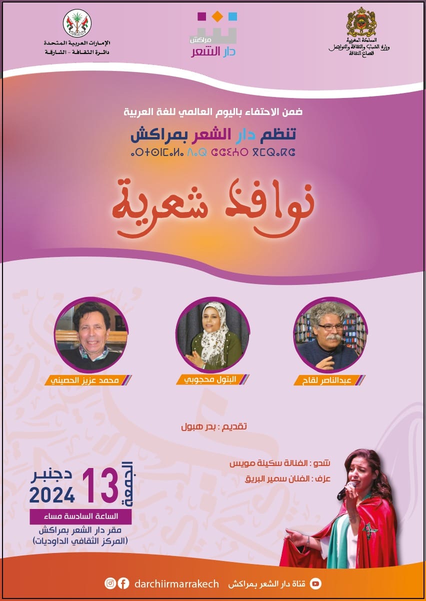 ضمن برنامج الاحتفاء باليوم العالمي للغة العربية، تنظم دار الشعر بمراكش ليلة “نوافذ شعرية” يوم الجمعة 13 من دجنبر الجاري، في مقر الدار (الكائن بالمركز الثقافي الداوديات) على الساعة السادسة مساء، بمشاركة الشعراء: محمد عزيز الحصيني وعبدالناصر لقاح والبتول محجوبي.