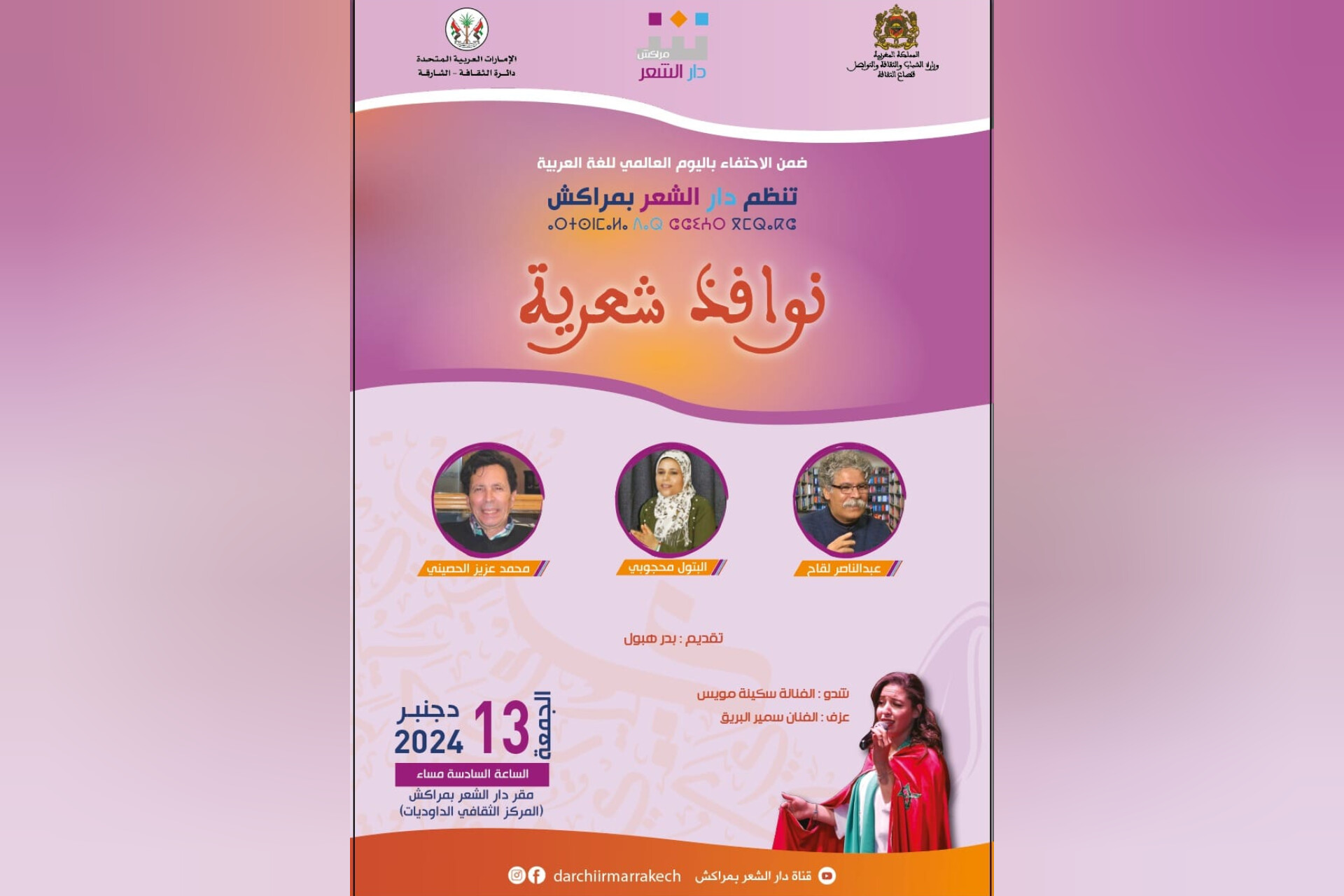 ضمن برنامج الاحتفاء باليوم العالمي للغة العربية، تنظم دار الشعر بمراكش ليلة “نوافذ شعرية” يوم الجمعة 13 من دجنبر الجاري، في مقر الدار (الكائن بالمركز الثقافي الداوديات) على الساعة السادسة مساء، بمشاركة الشعراء: محمد عزيز الحصيني وعبدالناصر لقاح والبتول محجوبي.