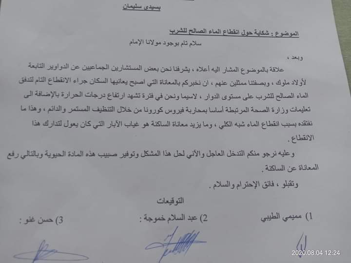 أمام هذا الوضع ، راسلت هيئات مدنية و سياسية الجهات المسؤولة عن تدبير قطاع الماء بالاقليم ، حيت قام مستشارون بجماعة دار بلعامري ( دائرة اولاد ملوك ) بتحرير مراسلة للسيد مدير المكتب الوطني للكهرباء و الماء – قطاع الماء ، تتوفر الجريدة على نسخة منها ، يطالبون السيد المدير بالتدخل لحل هذا المشكل خاصة مع ظروف الصيف و حاجة المواطنين للنظافة باستمرار مع أوضاع انتشار كورونا 19 .