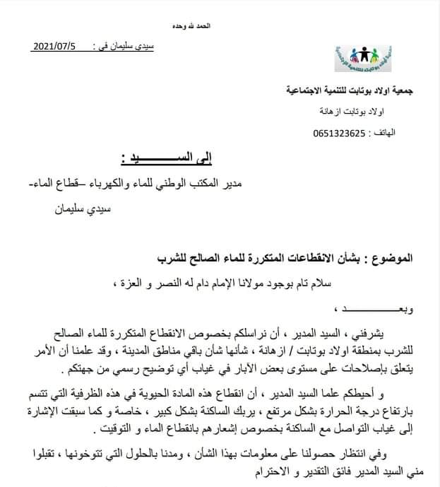 وفي جهة مقابلة غير بعيد عن اولاد ملوك ، راسلت جمعية اولاد بوتابت للتنمية الاجتماعية التي تنشط بمنطقة ازهانة برئاسة ادريس بلوالي المسؤولين على قطاع تدبير الماء ، تتوفر الجريدة على نسخة منها ، من أجل تفعيل التواصل مع الساكنة عندما يتعلق الأمر بقطع الماء و إحاطتهم علما بالتوقيت المعني بالانقطاع ، كما طالبت الجمعية باطلاع القطاع المسؤول على تدبير الماء بالاقليم المجتمع المدني على الحلول التي ينوي اتخاذها لحل الاشكال ، خاصة و أن الفترة هي فترة صيف .