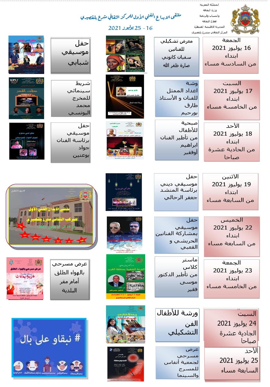 الأحد 18 يوليوز 2021 الحادية عشرة صباحا : صبحية تربوية للأطفال من تأطير الفنان ابراهيم أوفقير