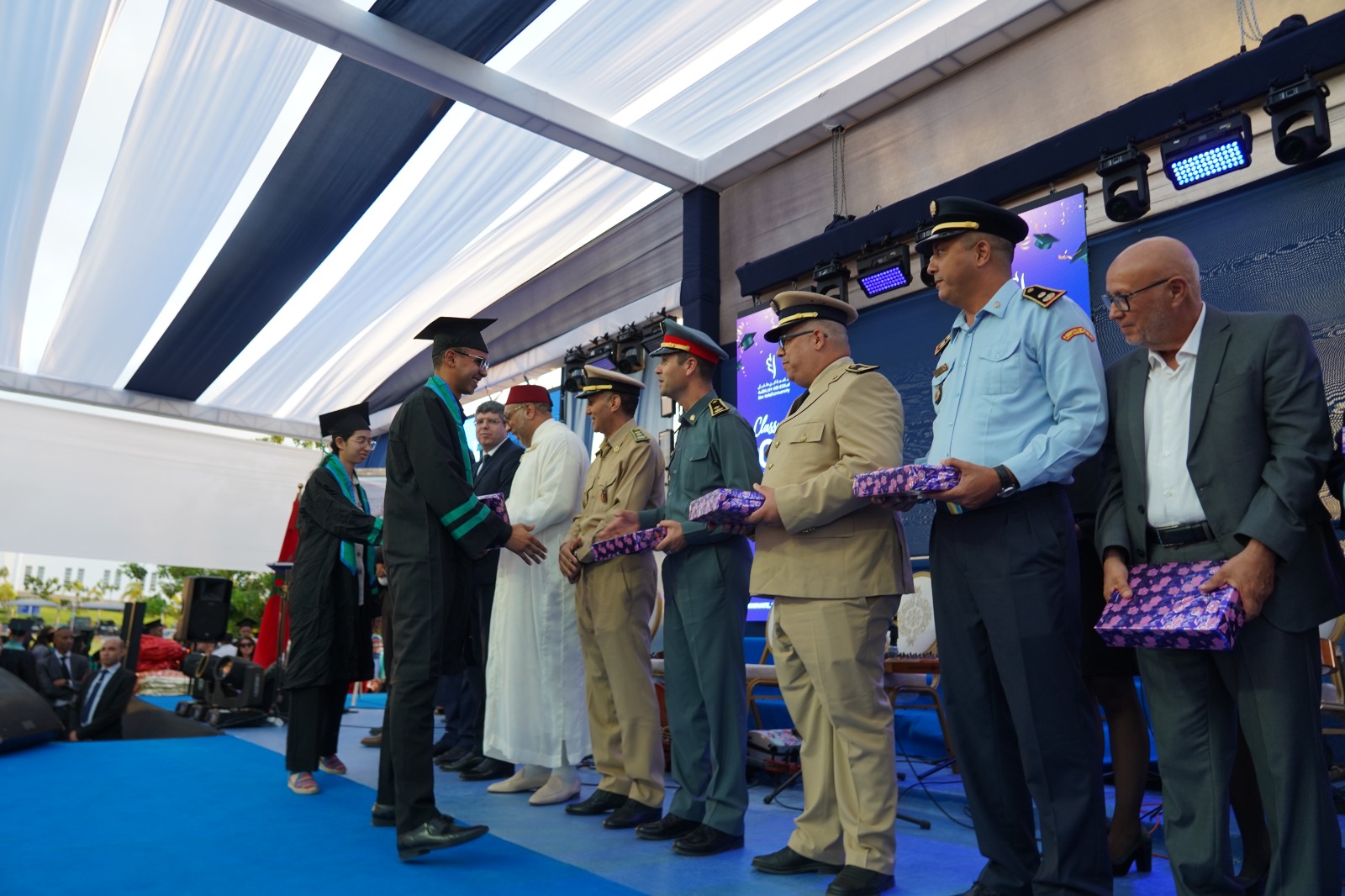 واستُهل الحفل بتلاوة آيات من الذكر الحكيم، أعقبتها لحظة تحية العلم الوطني، قبل أن يعيش الحضور لحظة مؤثرة تمثلت في موكب الخريجات والخريجين، الذين دخلوا ساحة الحفل في مشهد احتفالي يرمز إلى نهاية مرحلة دراسية وبداية مسار جديد.