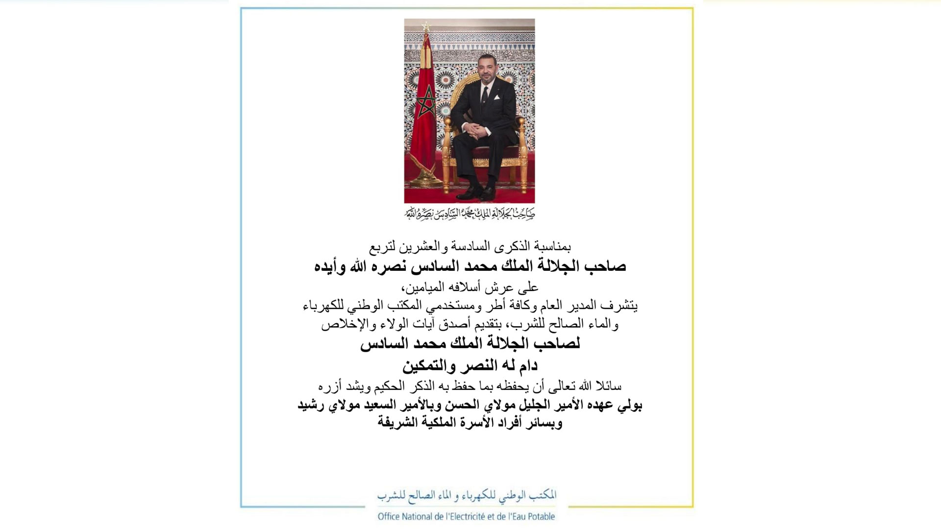برقية ولاء وتجديد العهد لجلالة الملك محمد السادس نصره الله بمناسبة الذكرى الـ26 لعيد العرش المجيد من أسرة المكتب الوطني للكهرباء والماء الصالح للشرب