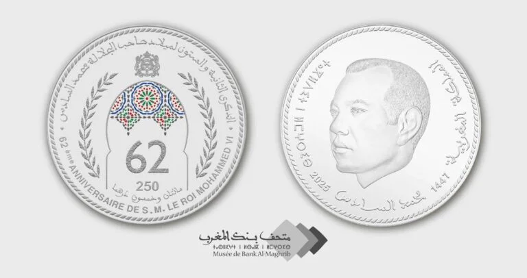 أما الجهة الخلفية للقطعة، فتتميز بتصميم فني يجمع بين شعار المملكة والزخارف التقليدية المغربية المستوحاة من فن الزليج، وتحيط بها أغصان الزيتون، ويتوسطها الرقم “62” إشارة إلى سنوية الميلاد، إلى جانب القيمة الاسمية للقطعة مكتوبة بالأرقام والحروف: “250” و”مائتان وخمسون درهماً”.