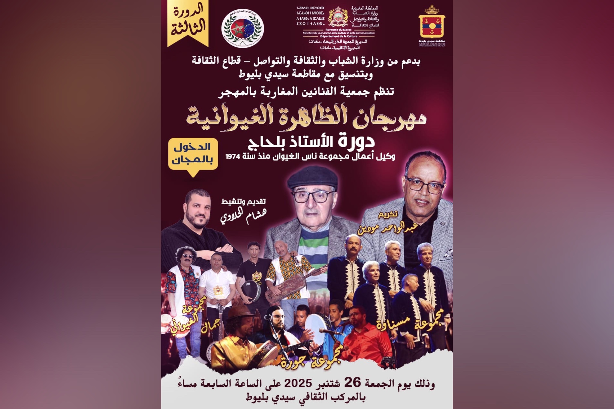تستعد مدينة الدار البيضاء لاحتضان الدورة الثالثة من مهرجان الظاهرة الغيوانية، المنظم من طرف جمعية الفنانين المغاربة بالمهجر، وذلك يومي 26 و27 شتنبر 2025 بالمركب الثقافي سيدي بليوط، ويأتي هذا الحدث بدعم من وزارة الشباب والثقافة والتواصل – قطاع الثقافة، وبتنسيق مع مقاطعة سيدي بليوط.