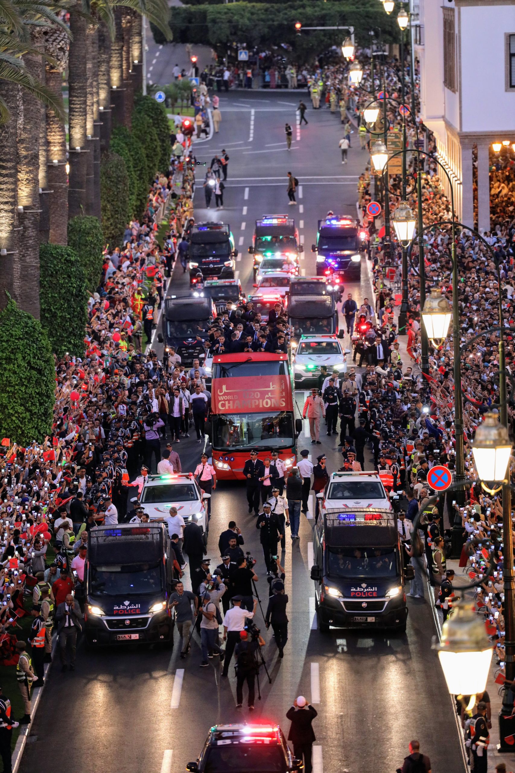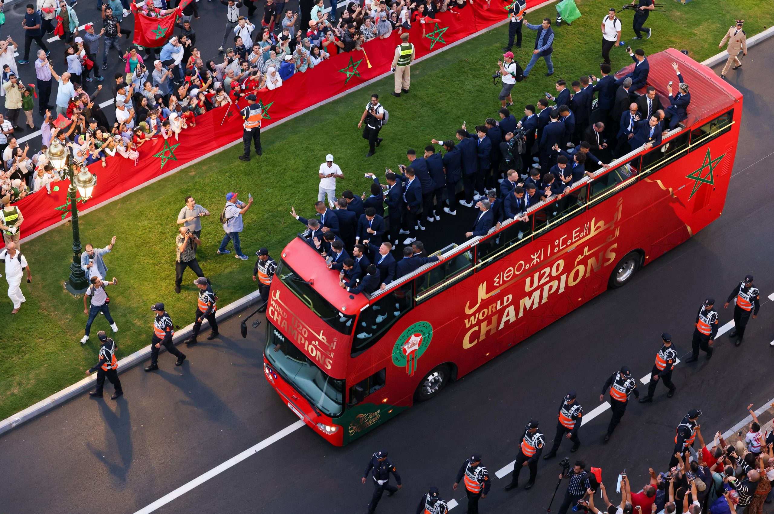 وجابت الحافلة المكشوفة التي تقل أبطال العالم، والمزدانة بالألوان الوطنية، شوارع الرباط وسط تصفيقات الجماهير وزغاريد النساء، فيما تحوّلت المدينة إلى لوحة نابضة بالأحمر والأخضر، زُيّنت فيها الشرفات والنوافذ بالرايات المغربية في مشهد يعكس وحدة الفرح الوطني.