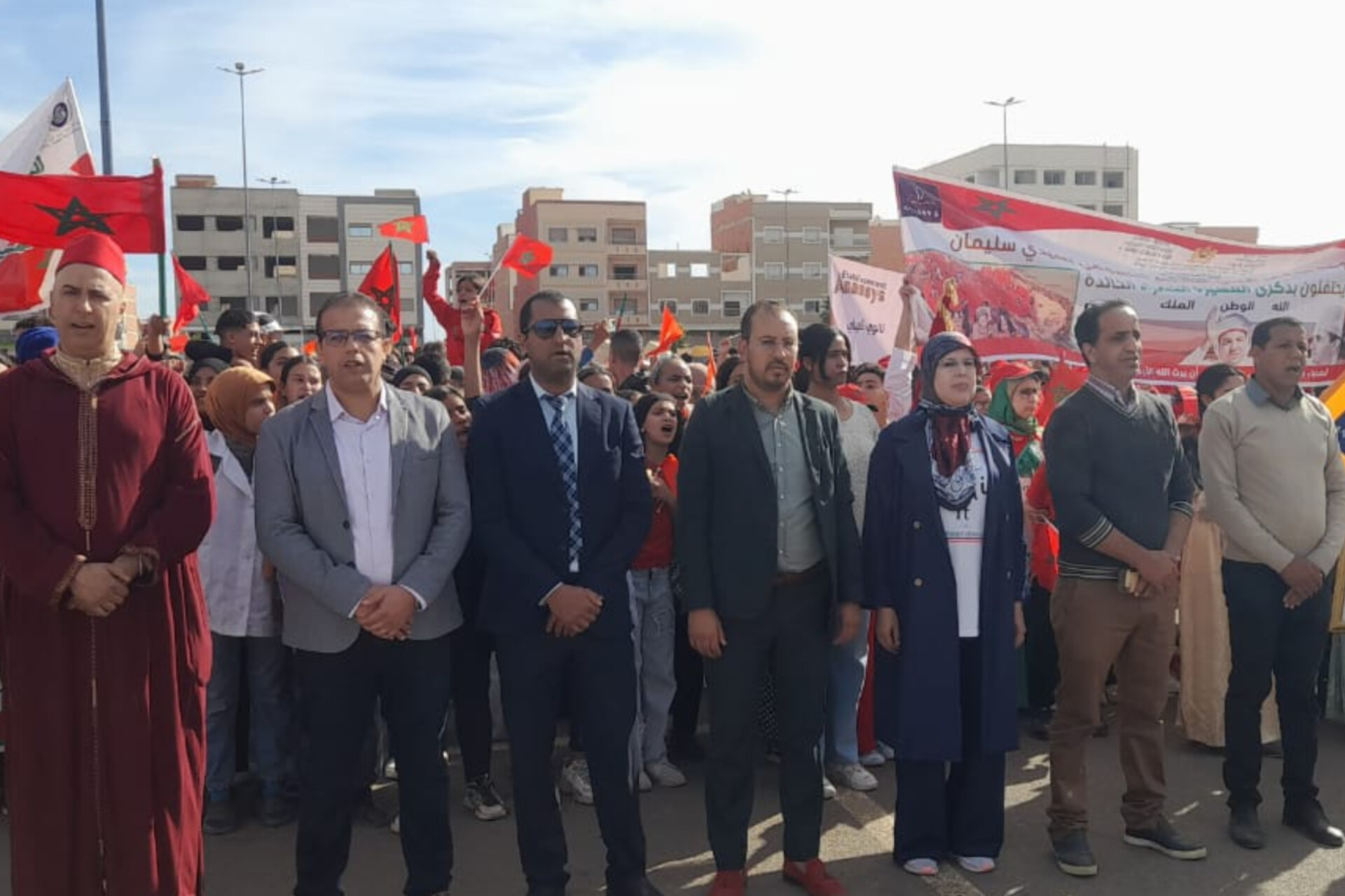 وانطلقت المسيرة من ملاعب مركز التفتح الفني والأدبي “الأجيال الصاعدة” بحي مرجان على الساعة العاشرة صباحاً، وجابت أهم أزقة الحي إلى غاية شارع الحسن الثاني بالطريق الوطنية رقم 4، قبل أن تتجه نحو ساحة مرجان، حيث قدّم التلاميذ لوحات فنية باللباس التقليدي وأقمصة تحمل ألوان العلم الوطني، مردّدين أناشيد وأغاني وطنية تمجد مغربية الصحراء، إضافة إلى النشيد الوطني الذي رُفع بأصواتهم بحماس كبير.