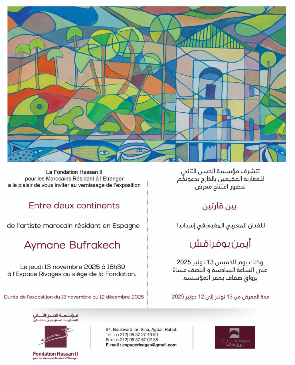 تنظم مؤسسة الحسن الثاني للمغاربة المقيمين بالخارج معرضاً فنياً بعنوان «بين قارّتين» للفنان المغربي المقيم بإسبانيا أيمن بوفراقش، وذلك خلال الفترة الممتدة من 13 نونبر إلى غاية 12 دجنبر 2025 بفضاء معارض بمقر المؤسسة بالرباط.