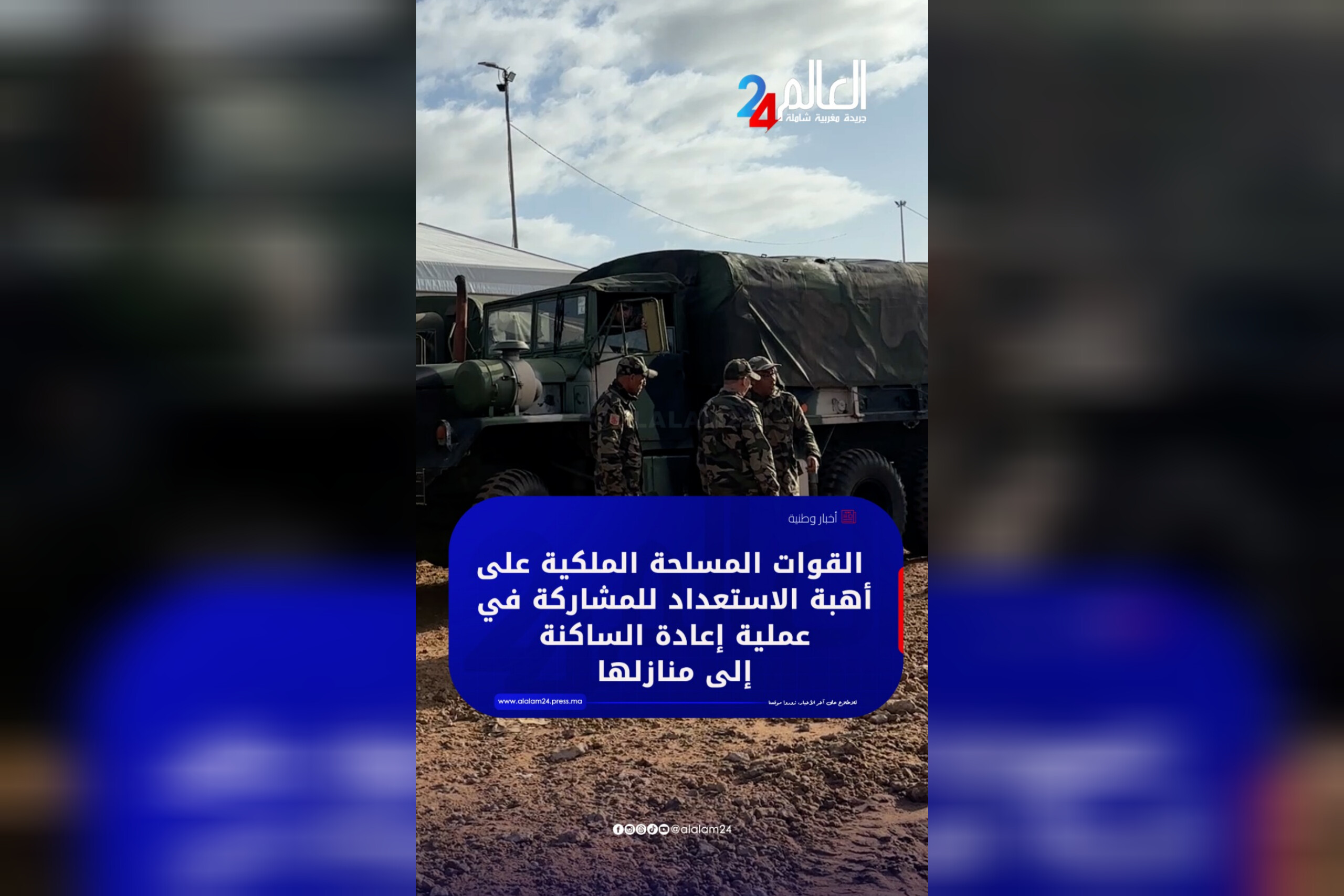 الرئيسيةصوت وصورةالقوات المسلحة الملكية على أهبة الاستعداد للمشاركة في عملية إعادة الساكنة إلى منازلها القوات المسلحة الملكية على أهبة الاستعداد للمشاركة في عملية إعادة الساكنة إلى منازلها شارك Alalam-24 الأحد 15 فبراير 2026 شارك