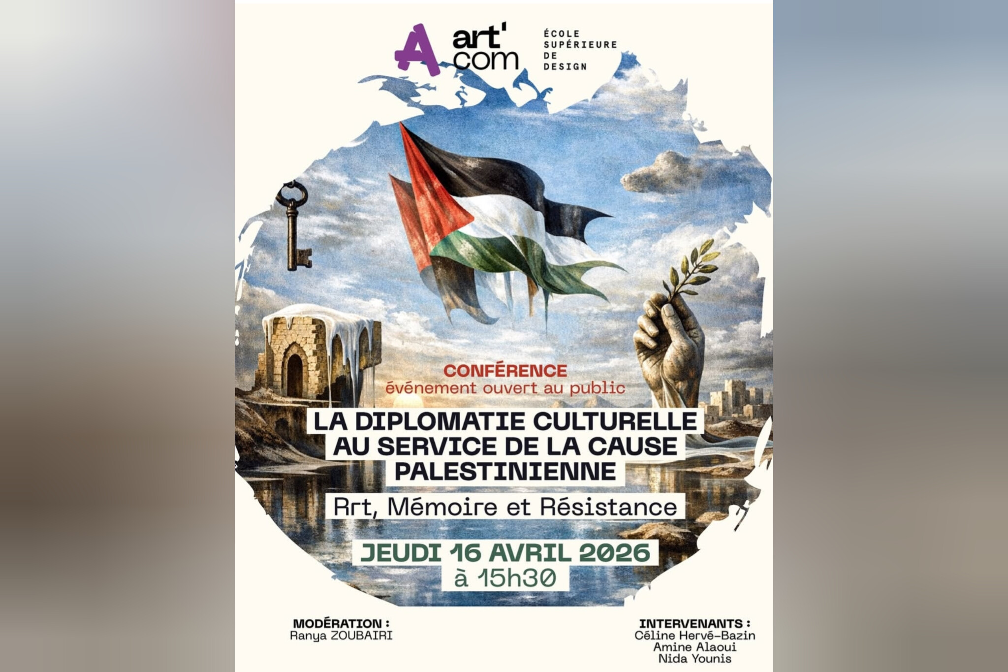Dans Dans le cadre des activités de médiation culturelle portées par le Laboratoire de Recherche et d’Innovation en Design et Communication (RIDEC-Rabat), Art’Com Sup organise, le jeudi 16 avril 2026 à partir de 15h30, une rencontre ouverte au public autour du thème : « La diplomatie culturelle au service de la cause palestinienne : art, mémoire et résistance ».