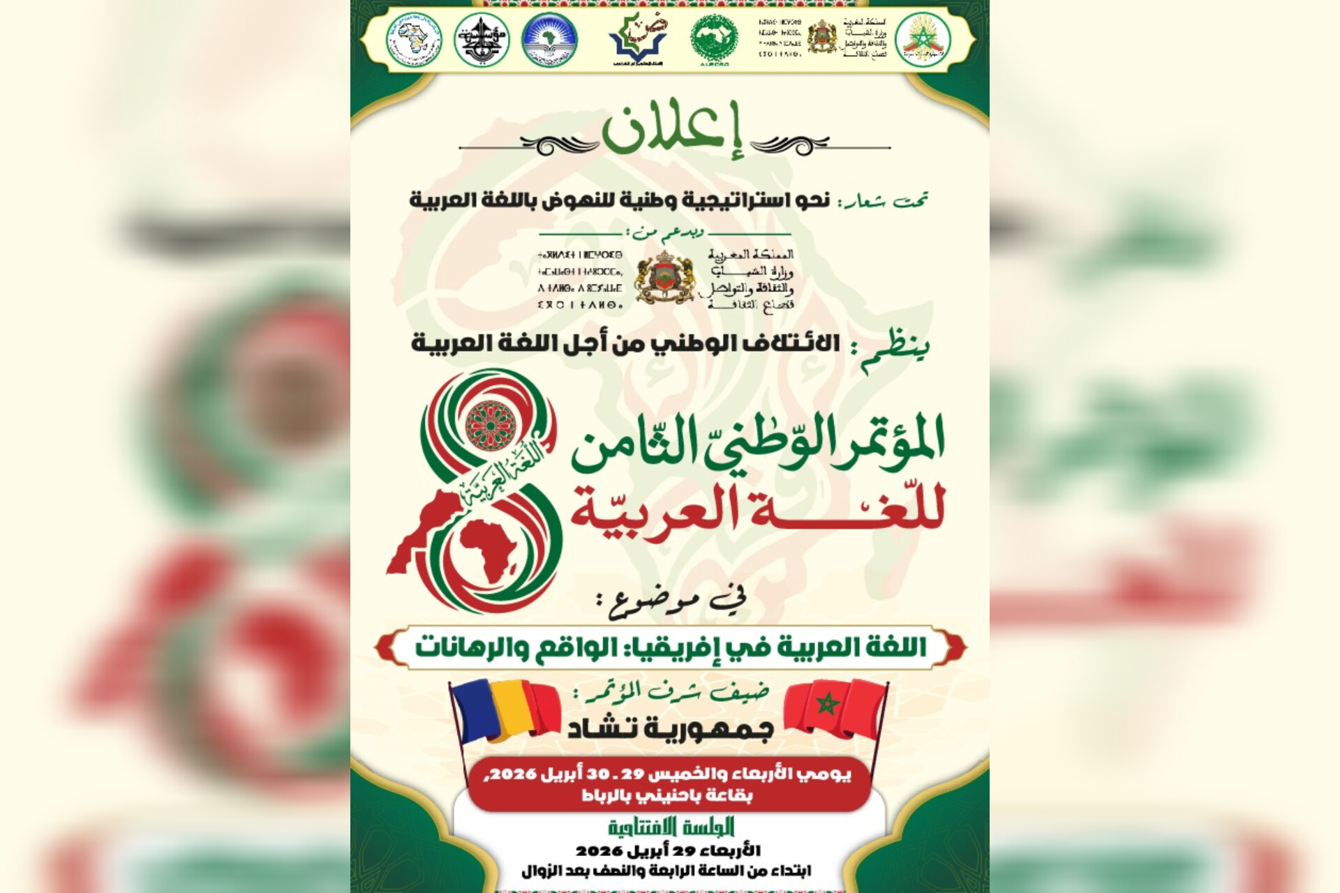 أعلن الائتلاف الوطني من أجل اللغة العربية بالمغرب تنظيم المؤتمر الوطني الثامن للغة العربية، تحت شعار “اللغة العربية في إفريقيا: الواقع والرهانات”، وذلك يومي الأربعاء والخميس 29 و30 أبريل 2026 بمدينة الرباط.
