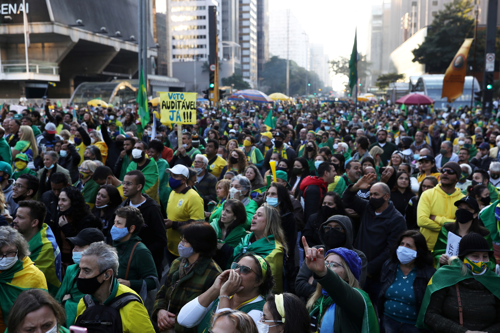 وفي ريو دي جانيرو، سار نحو ثلاثة آلاف شخص على شاطئ كوباكابانا معظمهم بلا كمامات، وارتدوا ملابس باللونين الأصفر والأخضر اللذين يرمزان إلى العلم البرازيلي.