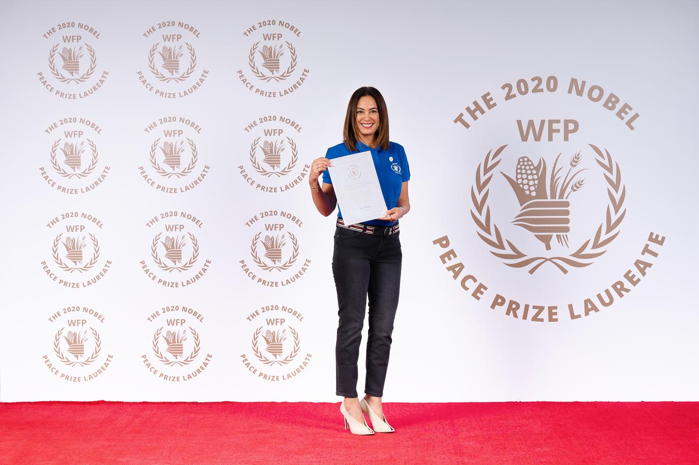 تحمل الشهادة الممنوحة للنجمة هند صبري توقيع ديفيد بيزلي، المدير التنفيذي لبرنامج الأغذية العالمي، الذي تسلم الجائزة نيابة عن البرنامج وموظفيه في احتفال افتراضي عبر الانترنت بسبب القيود المفروضة جراء جائحة فيروس كورونا.