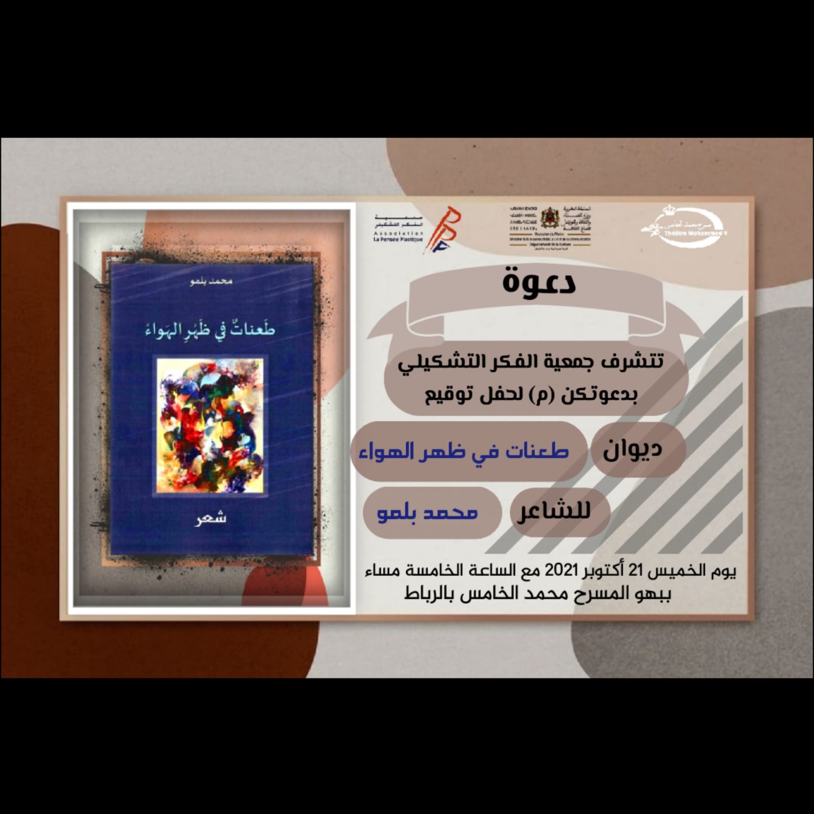تنظم جمعية الفكر التشكيلي يوم الخميس 21 أكتوبر 2021 حفل توقيع ديوان “طعنات في ظهر الهواء” للشاعر محمد بلمو الذي أصدرته ضمن منشوراتها في دجنبر 2019 وتعذر إقامة حفلات لتوقيعه بسبب وباء كورونا.