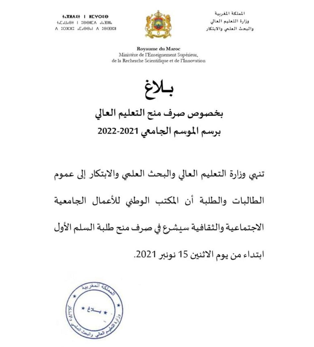 تنهي وزارة التعليم العالي والبحث العلمي والابتكار إلى عموم الطالبات والطلبة أن المكتب الوطني للأعمال الجامعية الاجتماعية والثقافية سيشرع في صرف منح الطلبة السلم الأول ابتداء من يوم الإثنين 15 نونبر 2021.