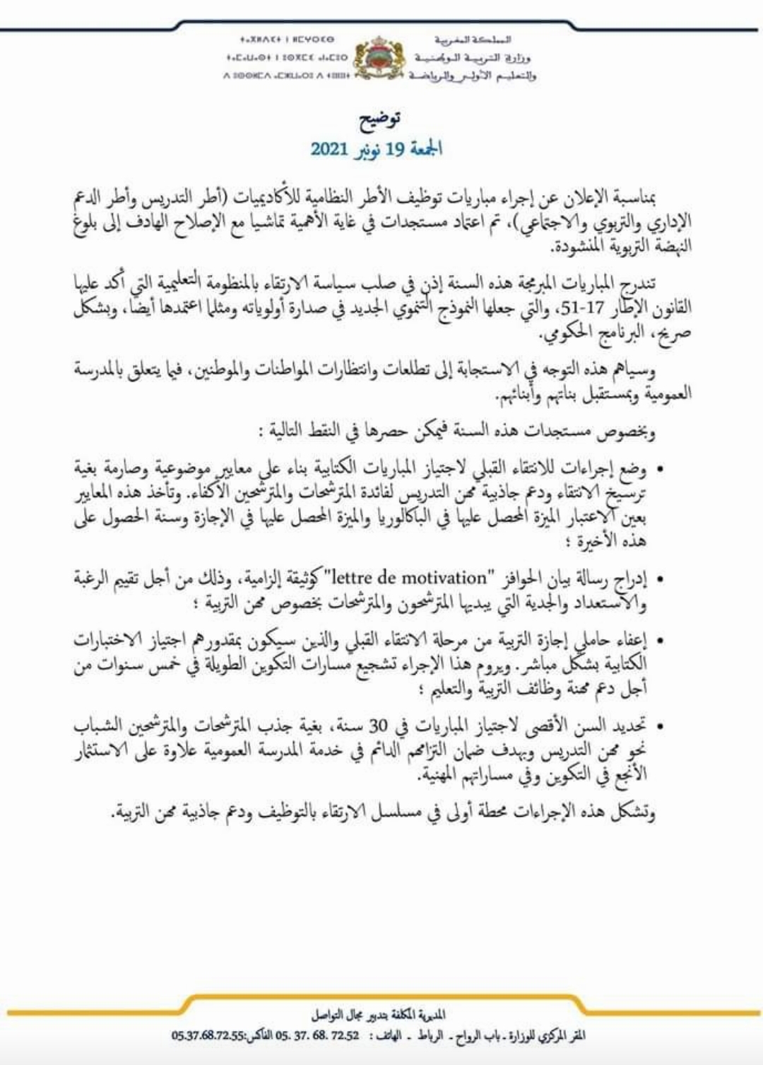 تداول مجموعة من حاملي الشهادات، من المعطلين في مواقع التواصل الاجتماعي الإعلان عن إجراء مباريات لتوظيف الأطر النظامية للأكاديميات، أطر التدريس و أطر الدعم الإداري و التربوي و الاجتماعي، مستنكرين فيه شرط تحديد السن في 30 إلى حدود تاريخ إجراء المباراة.
