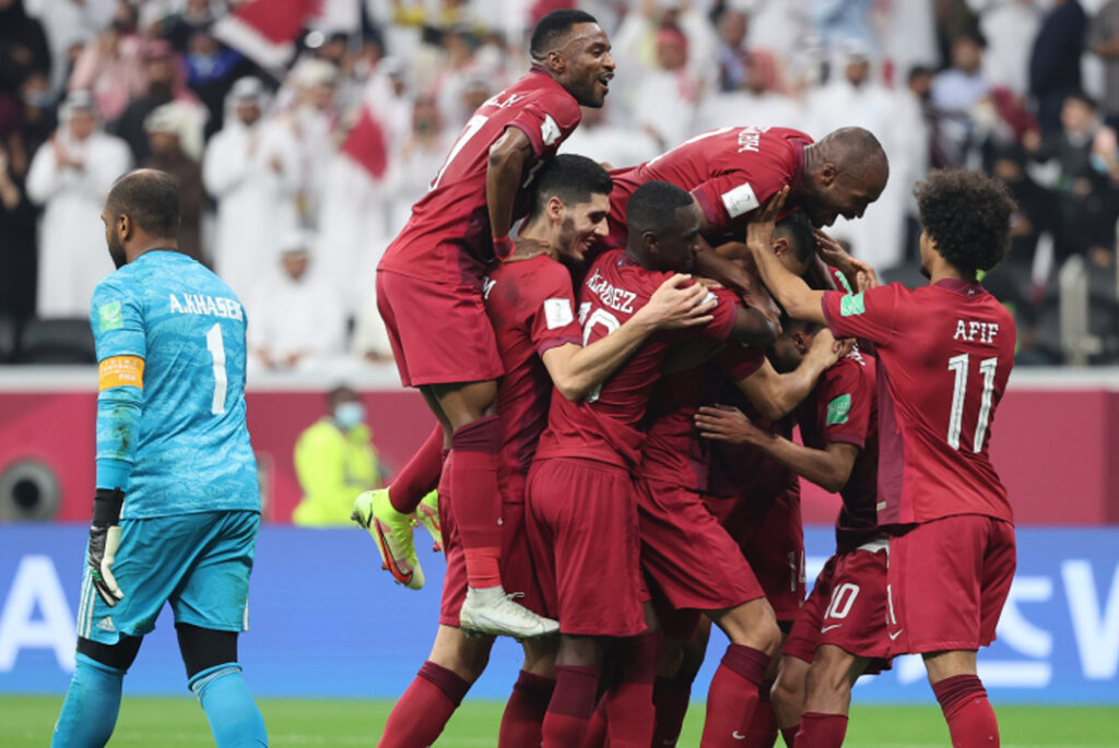 منتخب قطر إلى الدور نصف النهائي لبطولة كأس العرب 2021، بعد فوزه على نظيره الإماراتي بنتيجة 5-0، في المباراة التي جمعت بينهما أمس الجمعة على أرضية ملعب البيت.