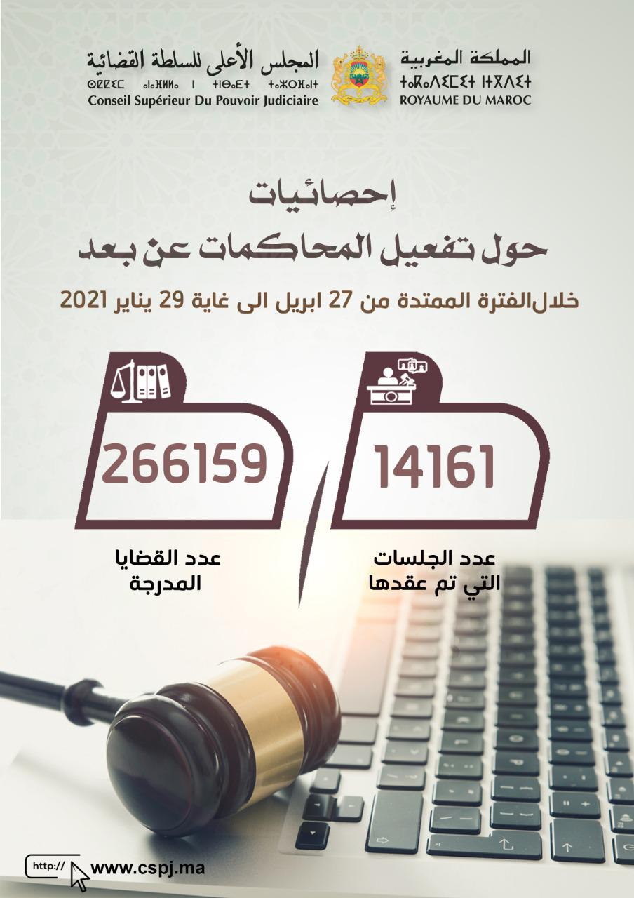 تكريسا لقيم الانفتاح والتواصل بخصوص مختلف التدابير المتخذة من طرف المجلس الأعلى للسلطة القضائية للحد من انتشار “فيروس كورونا” ببلادنا، ينهي المجلس للرأي العام الوطني أن مشروع المحاكمة عن بعد الذي أطلقه بمعية باقي الشركاء في منظومة العدالة، سجل خلال تسعة أشهر (الفترة الممتدة من 27 أبريل إلى 29 يناير 2021) حصيلة متميزة بالنظر إلى الأرقام المسجلة، بحيث عقدت مختلف محاكم المملكة خلال هذه الفترة 14161 جلسة أدرجت خلالها 266159 قضية، واستفاد منها آلاف المعتقلين تمت محاكمتهم عن بعد دون الحاجة إلى نقلهم إلى مقرات المحاكم.