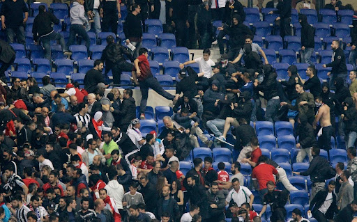 وأطلقت ألعاب نارية نحو مدرجات مشجعي ليون واندلعت الاشتباكات بينهما في المدرجات، مما أدى إلى تدخل وانتشار الشرطة. وأصيب شخصان، مشجع وشرطي بجروح.