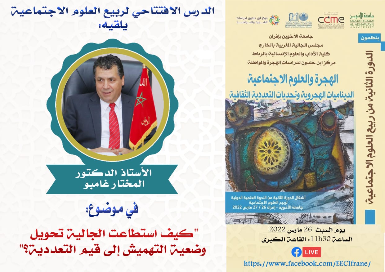 اِنطلقت اليوم السبت 26 مارس 2022 بإفران الدورة الثانية لربيع العلوم الاجتماعية بمشاركة نخبة من الباحثين والجامعيين من مختلف المؤسسات الجامعية الوطنية في فعاليات هذه التظاهرة العلمية المنظمة، على مدى يومين، من طرف كلية الآداب والعلوم الإنسانية (جامعة محمد الخامس الرباط)، وكلية الإنسانيات والعلوم الاجتماعية (جامعة الأخوين إفران)، ومجلس الجالية المغربية بالخارج. وتتضمن فعاليات هذا اللقاء ورشات تفكير وندوات علمية وحفلات توقيع كتب وتكريم لشخصيات علمية بارزة.