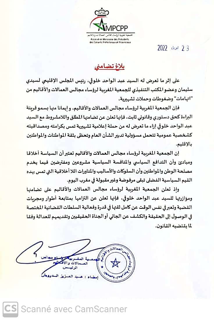 أعلنت الجمعية المغربية لرؤساء مجالس العمالات والأقاليم تضامنها المطلق واللامشروط مع السيد “عبد الواحد خلوقي”عضو مكتبها التنفيدي و رئيس المجلس الإقليمي لسيدي سليمان، على إثر ما تعرض له من ” اتهامات وضعوطات وحملات تشهيرية “.
