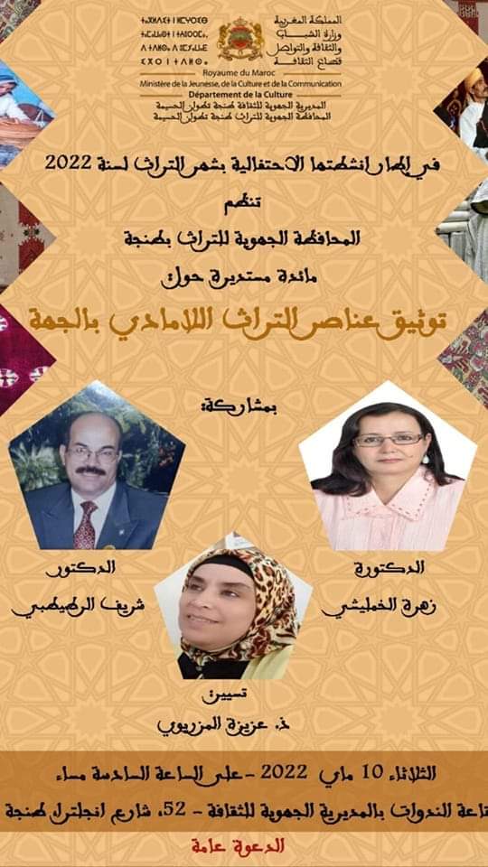 في إطار أنشطتها الإحتفالية بشهر التراث لسنة 2022، تنظم المحافظة الجهوية للتراث الثقافي بطنجة، مائدة مستديرة حول توثيق عناصر التراث اللامادي بجهة طنجة- تطوان-الحسيمة، بمشاركة: