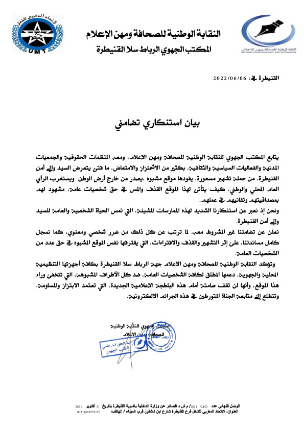 الرئيسيةمجتمعبيان استنكاري للنقابة الوطنية للصحافة ومهن الإعلام المكتب الجهوي الرباط سلا القنيطرة بيان استنكاري للنقابة الوطنية للصحافة ومهن الإعلام المكتب الجهوي الرباط سلا القنيطرة شارك العـــــالم 24 الإثنين 6 يونيو 2022 العالم24النقابة الوطنية للصحافة ومهن الإعلامبيان استنكاريجريدة إلكترونية مغربيةموقع إخباري مغربي شارك