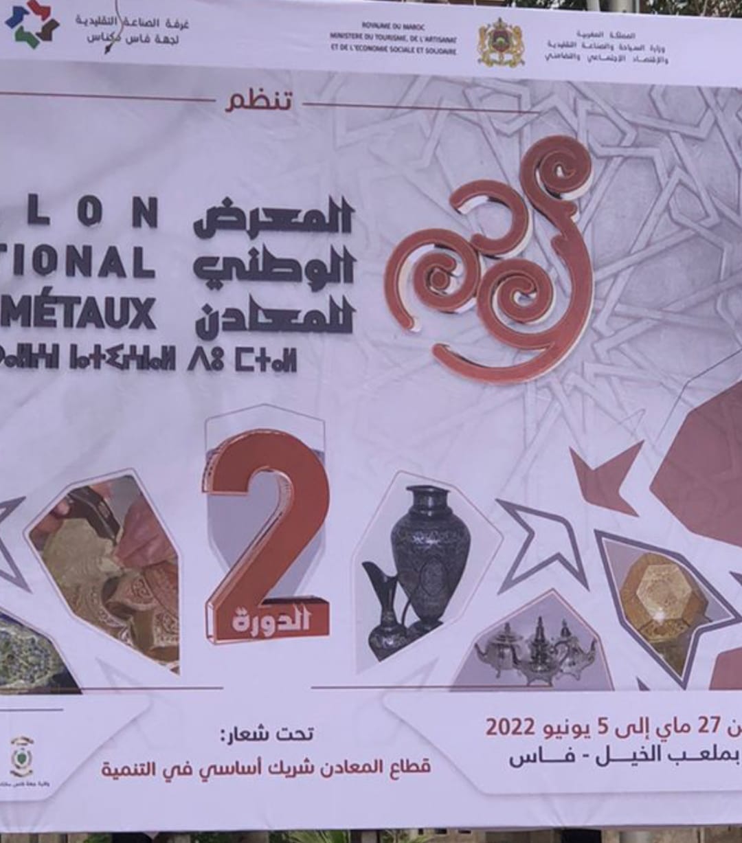 نظمت غرفة الصناعة التقليدية لجهة فاس مكناس بشراكة مع وزارة السياحة والصناعة التقليدية والاقتصاد الاجتماعي والتضامني وولاية جهة فاس مكناس ومجلس جهة فاس مكناس وجماعة فاس ومجلس عمالة فاس وبتنسيق مع المديرية الجهوية للصناعة التقليدية والاقتصاد الاجتماعي والتضامني بفاس النسخة الثانية للمعرض الوطني للمعادن بساحة ملعب الخيل بمدينة فاس، تحت شعار: “قطاع المعادن شريك أساسي في التنمية” وذالك من 27 ماي إلى غاية 05 يونيو 2022 .