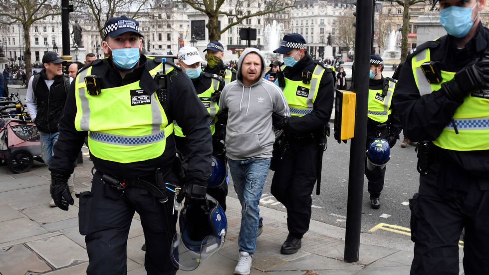 اعتقل 36 شخصا على الأقل وأصيب عدد من عناصر الشرطة، أمس السبت، خلال تظاهرة في لندن ضمت آلاف الأشخاص الذين خرجوا رفضا للحجر المفروض للمكافحة تفشي جائحة كوفيد-19.